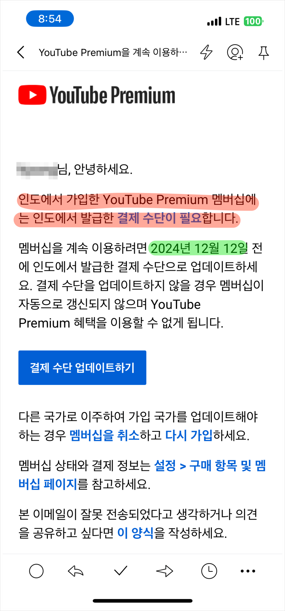 2024년 12월 12일 까지 인도에서 발급한 결제 수단으로 업데이트 하라는 거네요... ㅠㅠ
