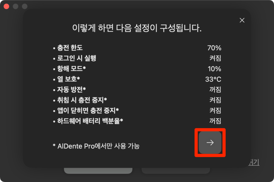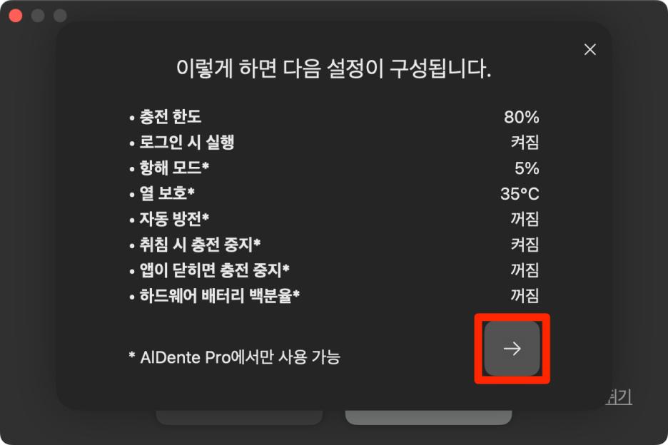 Aldente를 처음 실행하면 다음과 같이 최적화된 배터리 충전을 끄라고 합니다.