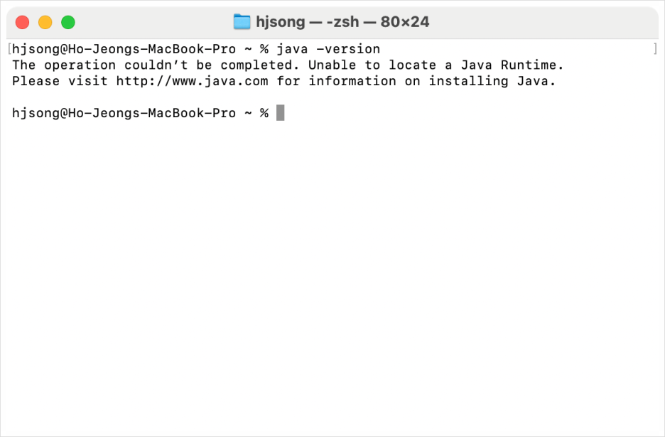 그 후, java -version을 입력하면 다음과 같이 JRE가 없다는 메시지를 확인할 수 있습니다.