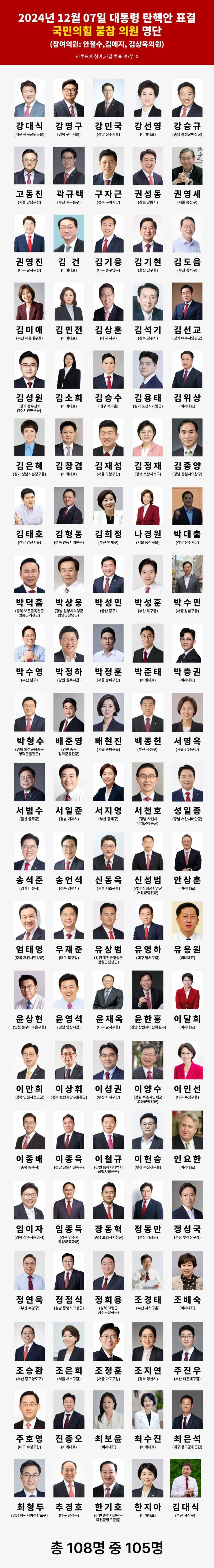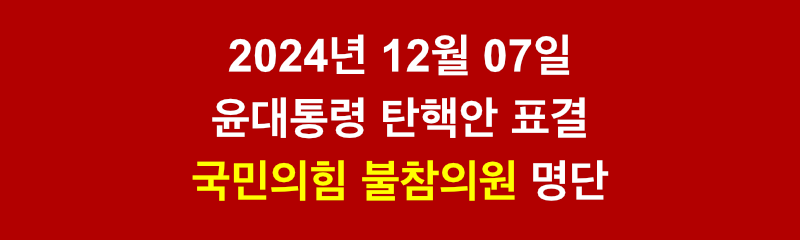 그래서 이 글을 통해 탄핵안 표결에 불참한 국민의힘 의원들의 명단을 기록하고, 다가오는 선거 때마다 이를 재차 상기시키고자 합니다.