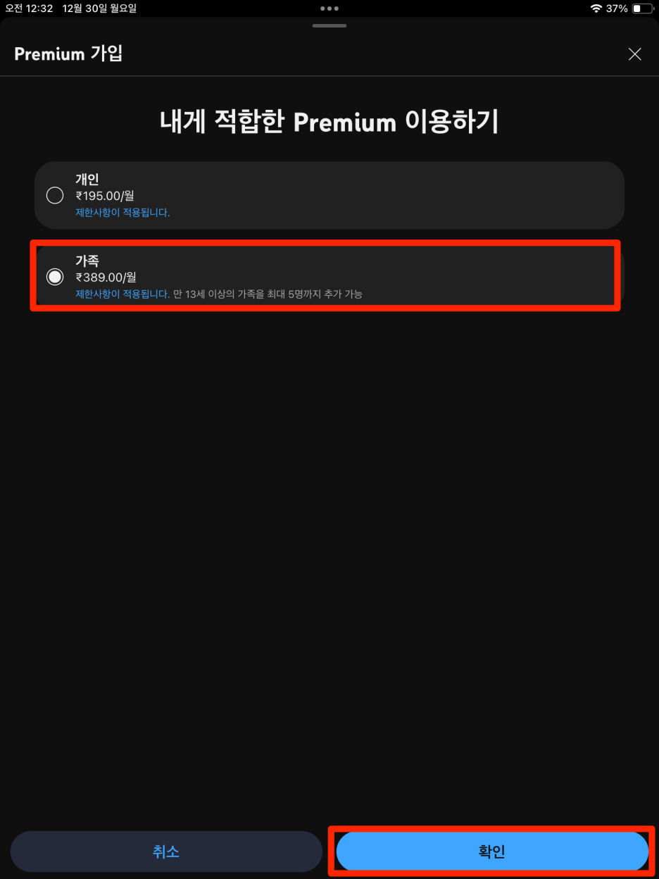 10. 패밀리 멤버십은 가족 초대(초대받는 계정도 인도 주소 이어야 함)
