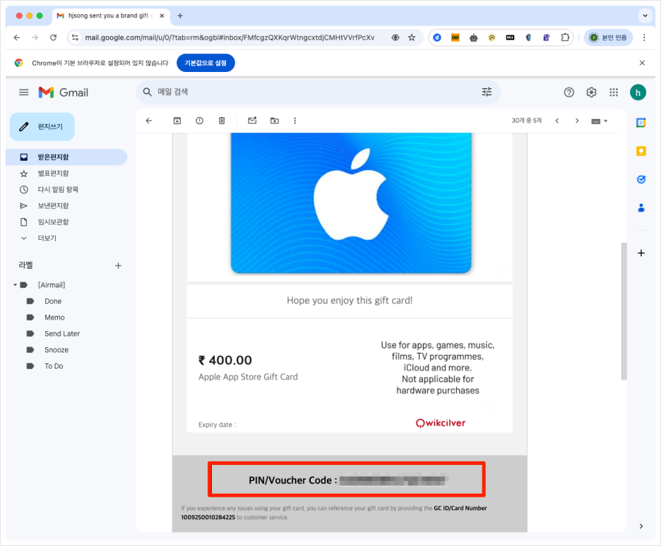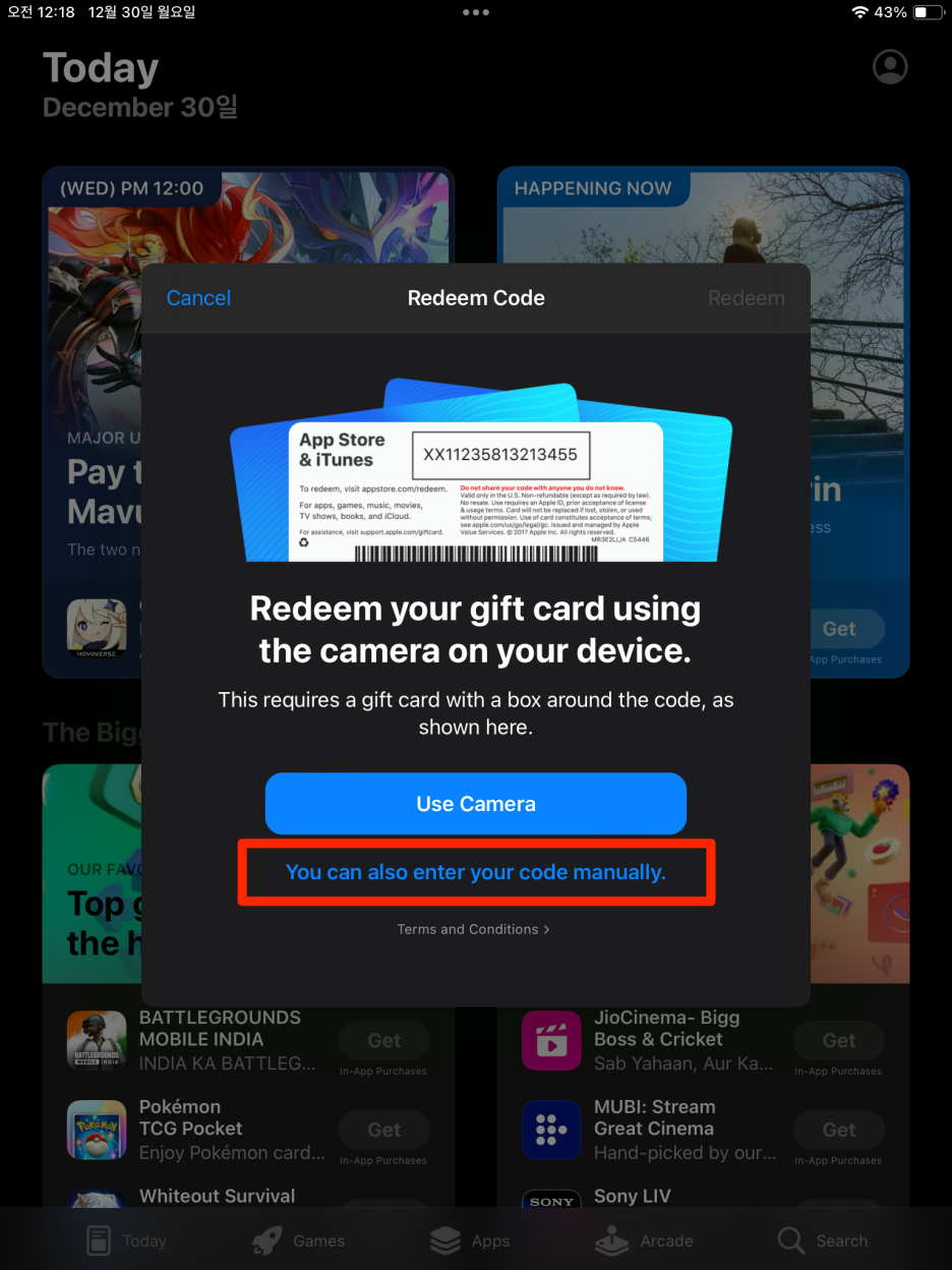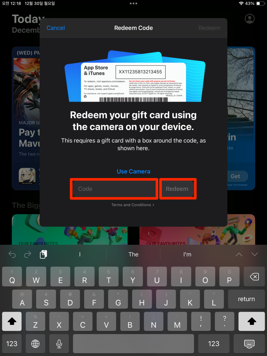 7. 3번에서 구매한 기프트카드로 충전(Redeem Gift Card or Code)