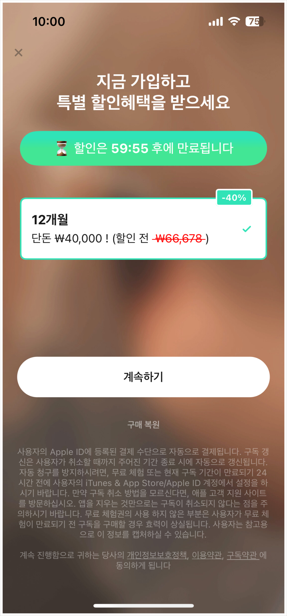 12개월 동안 40% 할인해서 40,000원(할인 전 66,678원)