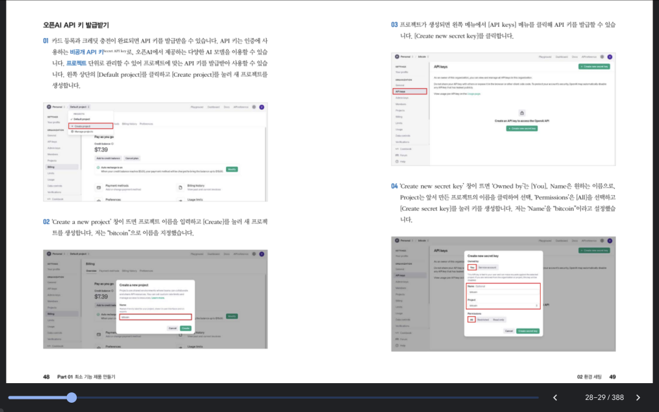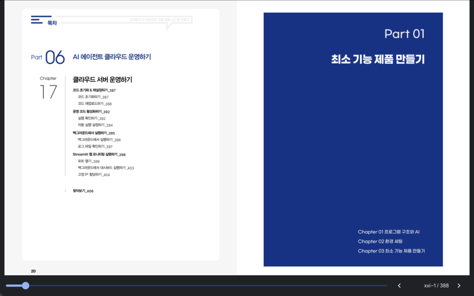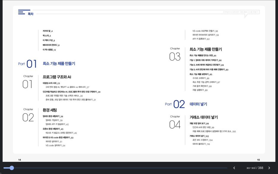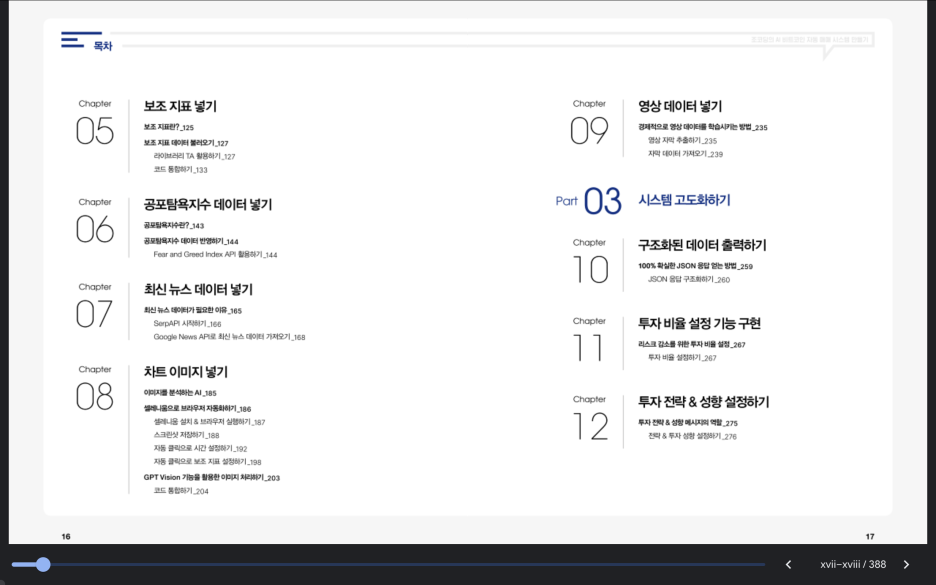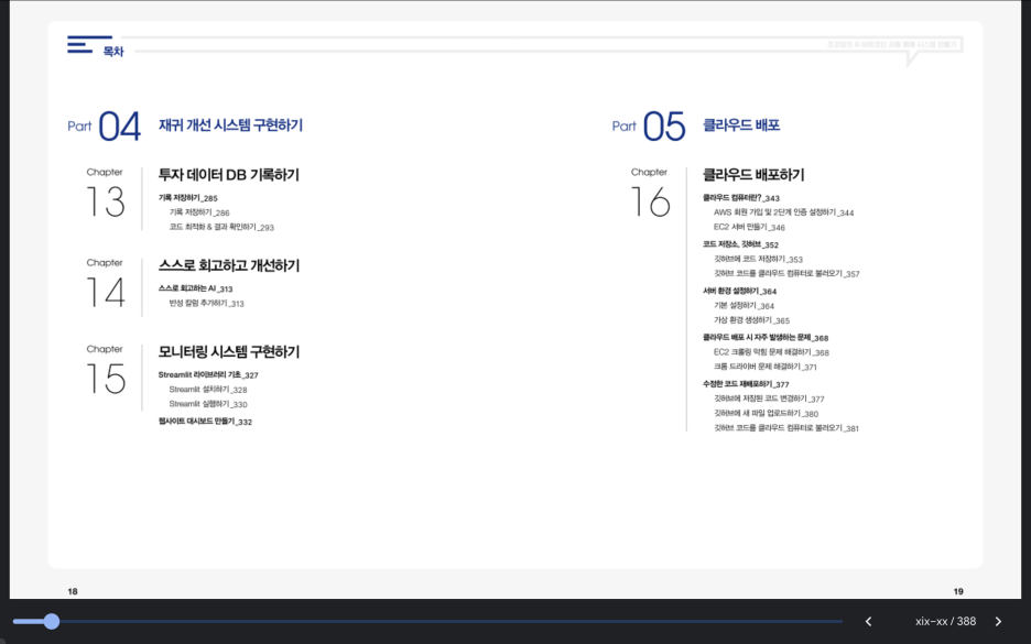 책의 내용은 최소 기능 제품에서 부터 거래소 데이터 넣기, 시스템 고도화, 재귀 개선 시스템 구현까지 전 과정을 따라 할 수 있도록 예제 형식으로 구성되어 있습니다.