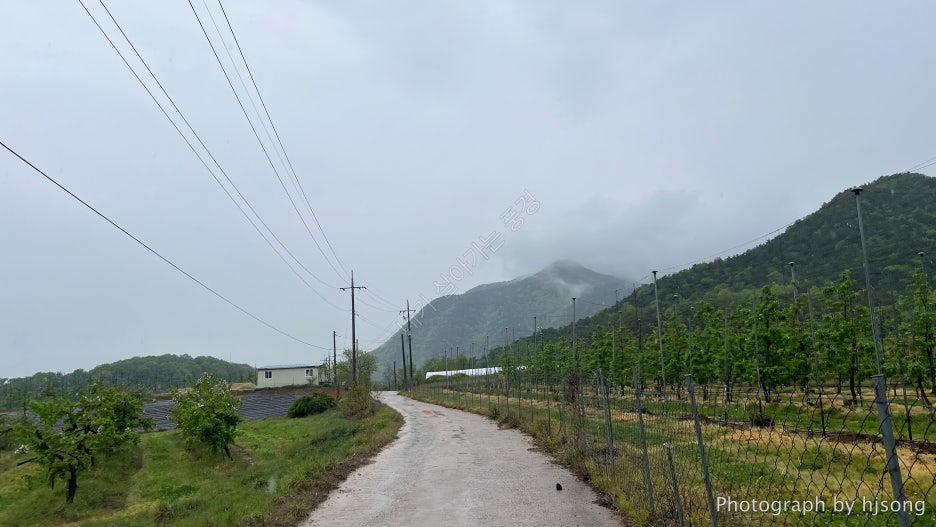 중간에 비가 내리기 시작하여 우비와 우산을 쓰고 걷고 있습니다.