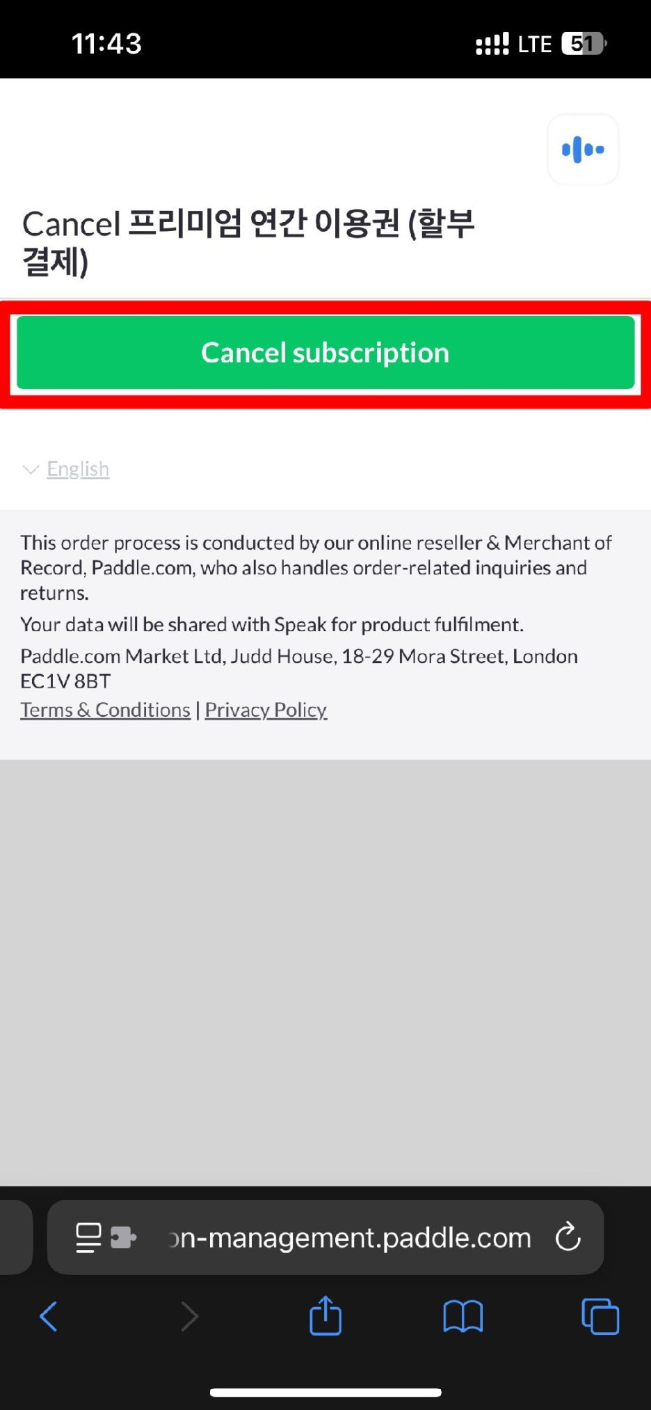 여기서 [Cancel subscription] 버튼을 누르면 정말로 끝납니다.