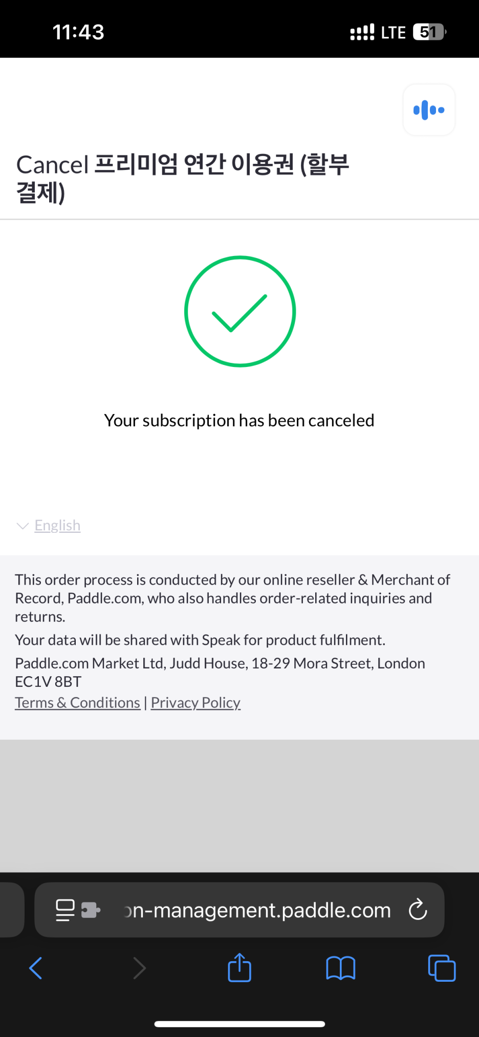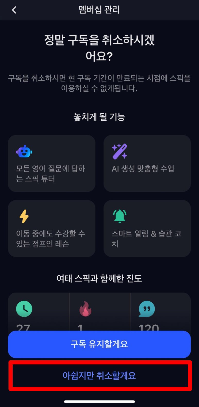 열심히 하지도 않는데 계속 멤버십 구독을 하고 있기에는 구독료가 아까워서 스픽 구독을 끝내기로 결정 했습니다.