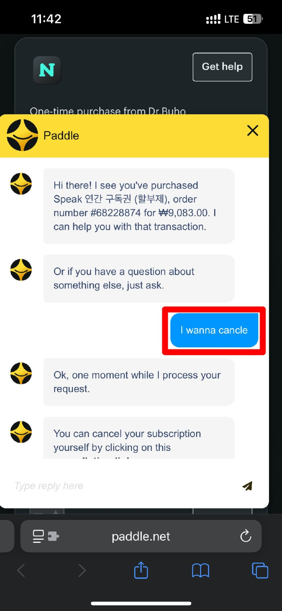 여기서 주저리 주저리 말 할 필요없이 "I wanna cancle"을 입력합니다.
