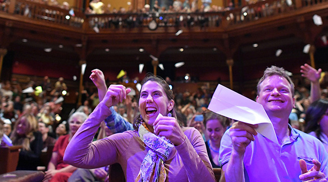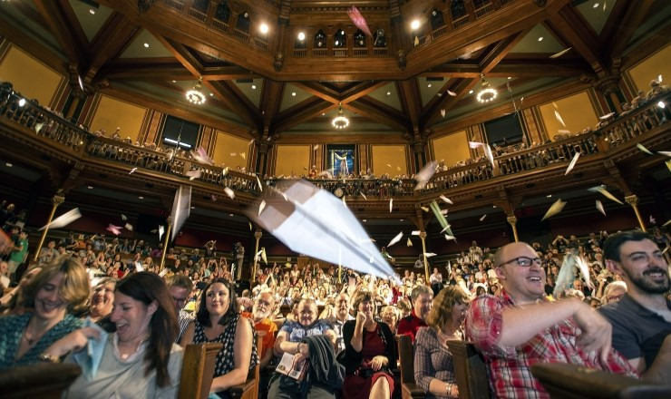 시상식은 전통적으로 관객들이 종이비행기를 무대에 던지는 퍼포먼스로 시작합니다. 이 장면은 이그 노벨상만의 자유롭고 유머러스한 분위기를 상징합니다.