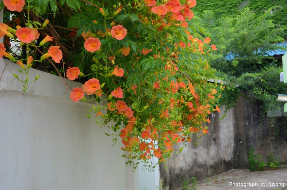 골목길을 걷다가 담장 너머로 수줍게 고개 내민 능소화와 마주치는 순간...