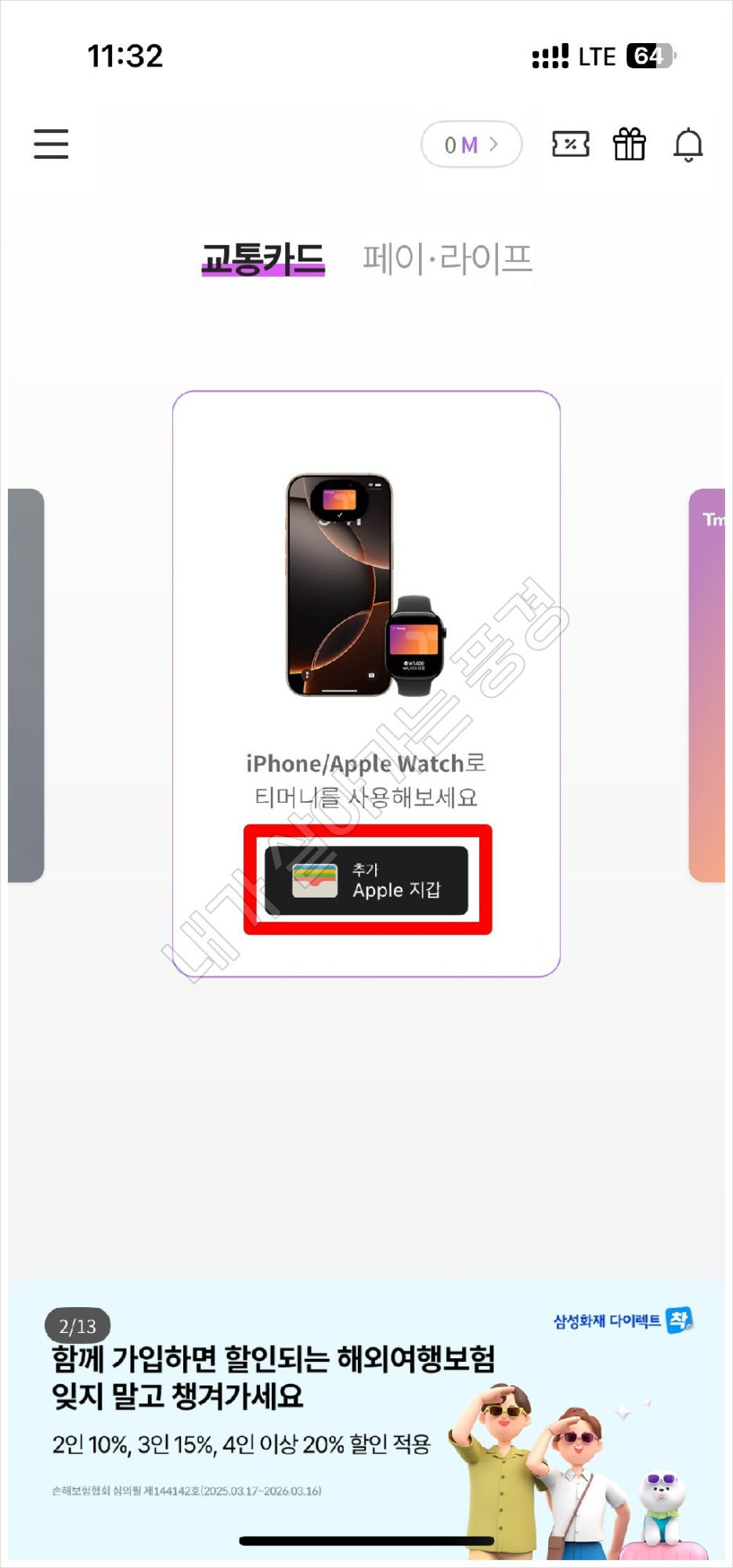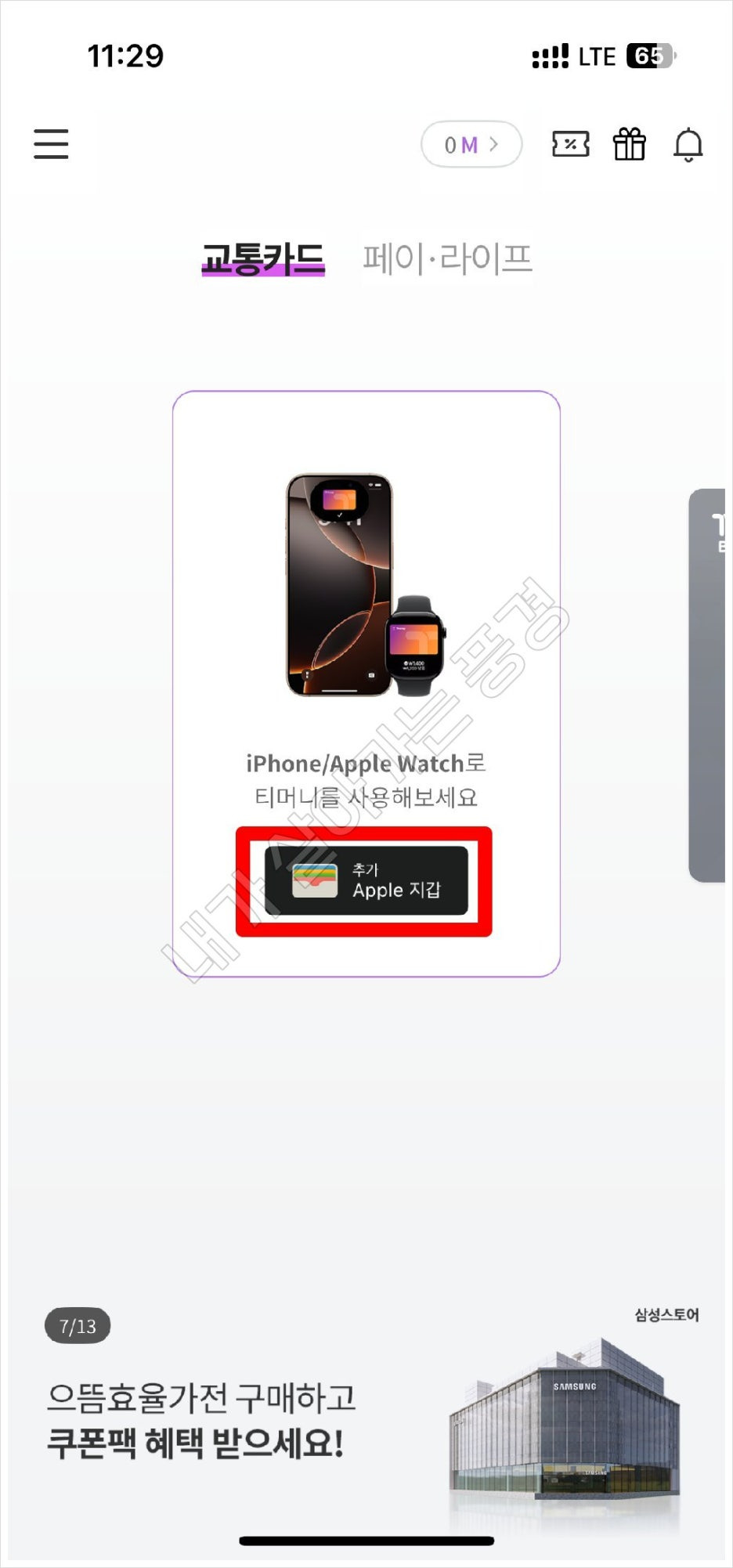 실물 카드 없이 아이폰과 애플워치로 대중교통을 이용할 수 있게 됐답니다.