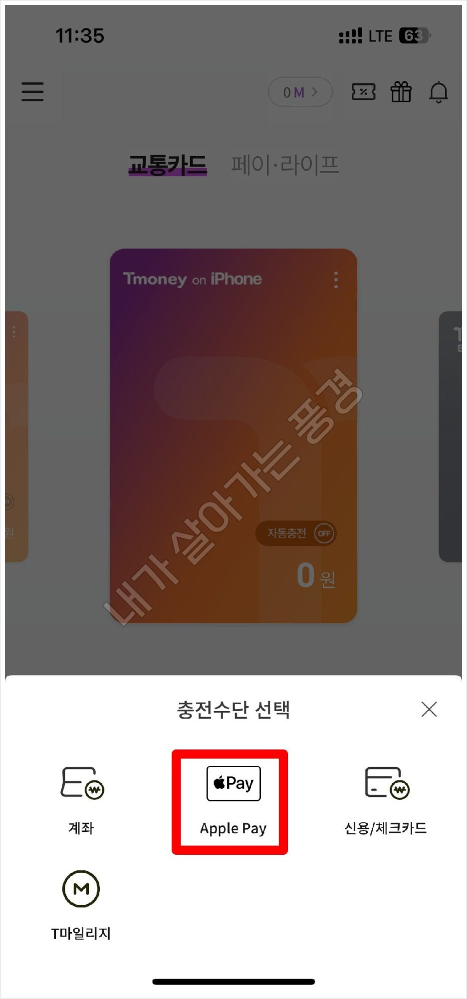 (티머니 앱에서는 애플페이 외에도 계좌나 신용카드로도 충전이 가능합니다.)