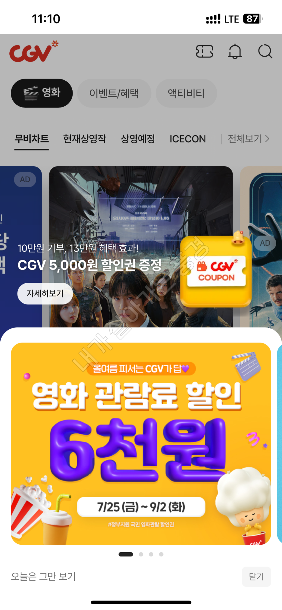 매월 마지막 수요일 영화를 7000원에 관람할 수 있는 '문화가 있는 날'에는 할인권을 사용하면 1000원으로 영화를 볼 수 있어요.