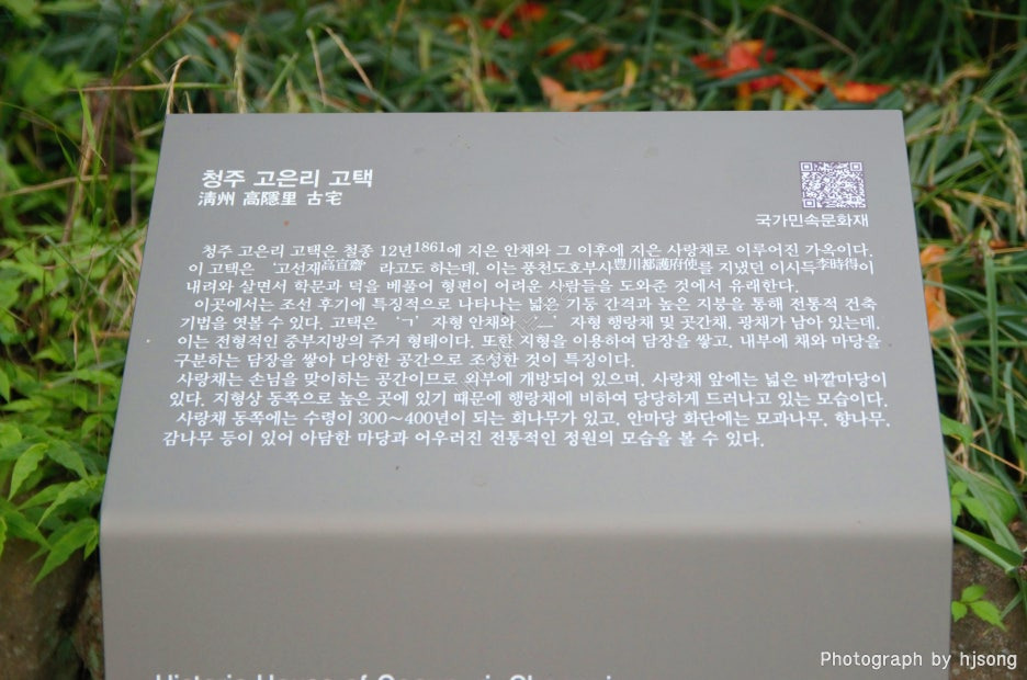 청주 고은리 고택은 철종 12년(1861)에 지어진 집으로, 중요민속문화재 제133호로 지정된 조선시대 가옥입니다!