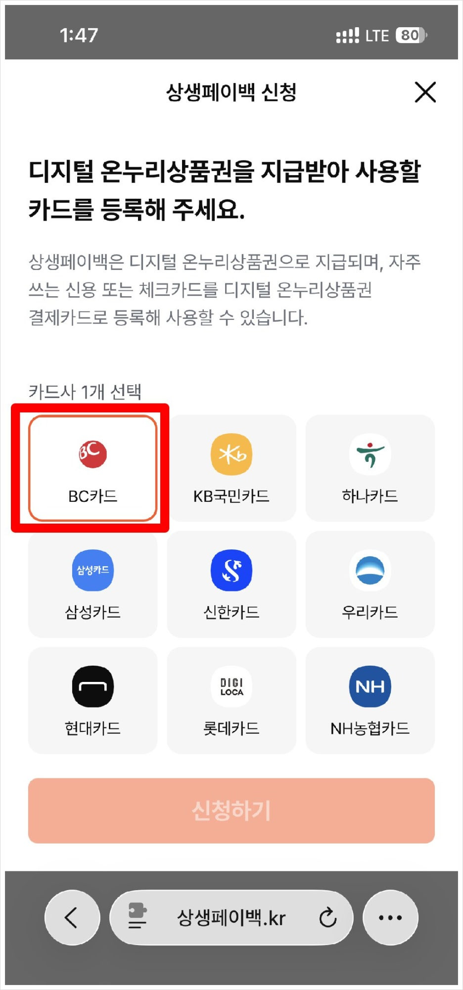 디지털 온누리상품권을 지급받을 카드를 선택합니다.