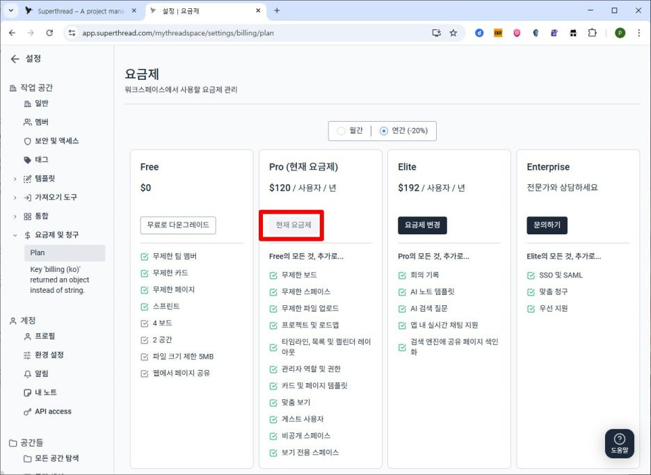 8) 요금제 중Pro 요금제의 [요금제 변경]을 클릭합니다.