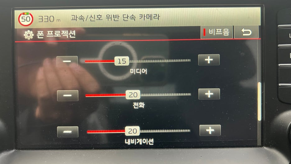 저는 미디어는 15정도, 전화는 20 정도, 내비게이션은 15 정도로 설정해뒀어요.