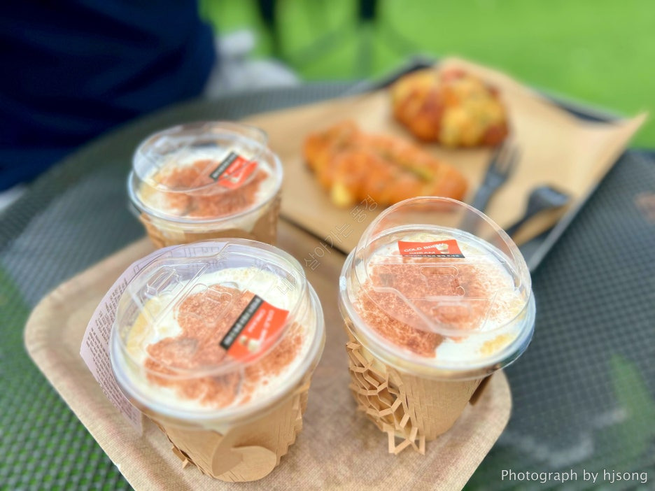 우리는 콜드블루크림라떼와 빵을 주문해서 먹으며,