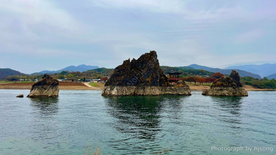 국내에서 강 한복판에 이렇게 세 개의 바위 봉우리가 나란히 있는 곳은 여기가 유일하다고 합니다!
