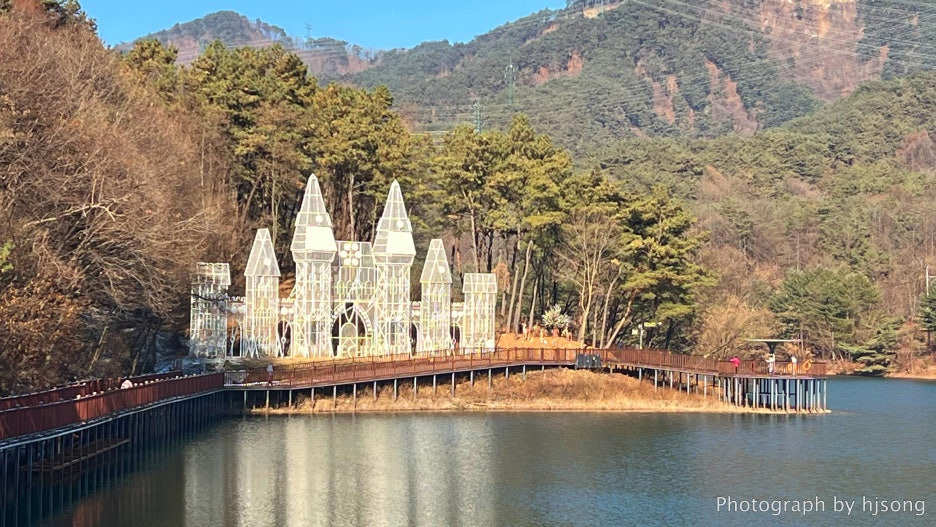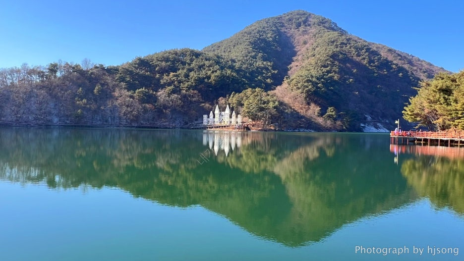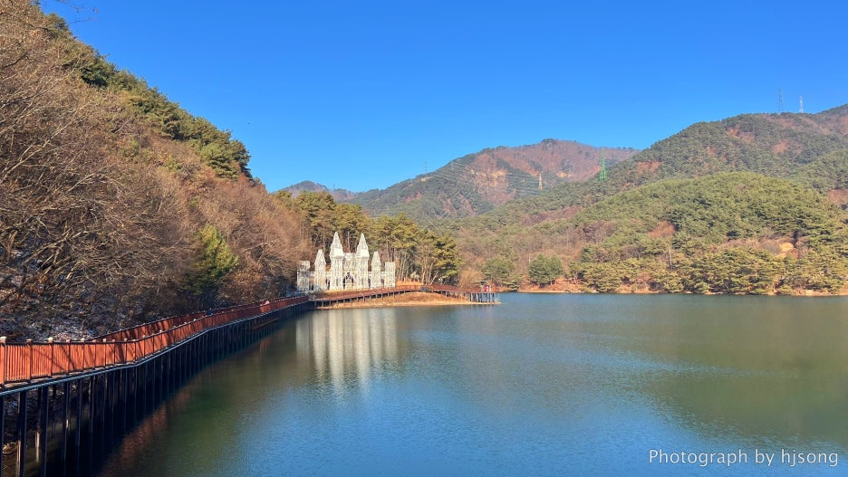 비룡담 저수지 중앙에 있는 하얀 건물이 마치 유럽의 어느 고성 같더라고요.