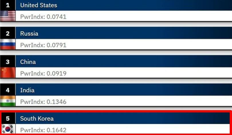 우리나라가 군사력 5위를 유지할 수 있는 또 다른 이유는 바로 휴전국가라는 특수성입니다.
