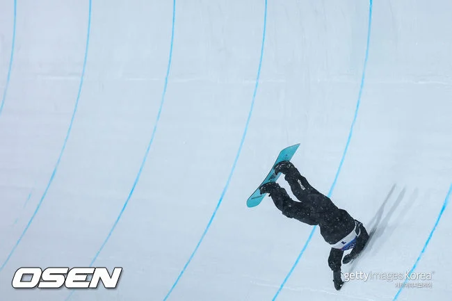 1차 시기, 두 번째 점프에서 최가온은 하프파이프 가장자리(코핑)에 부딪히며 크게 넘어졌습니다.