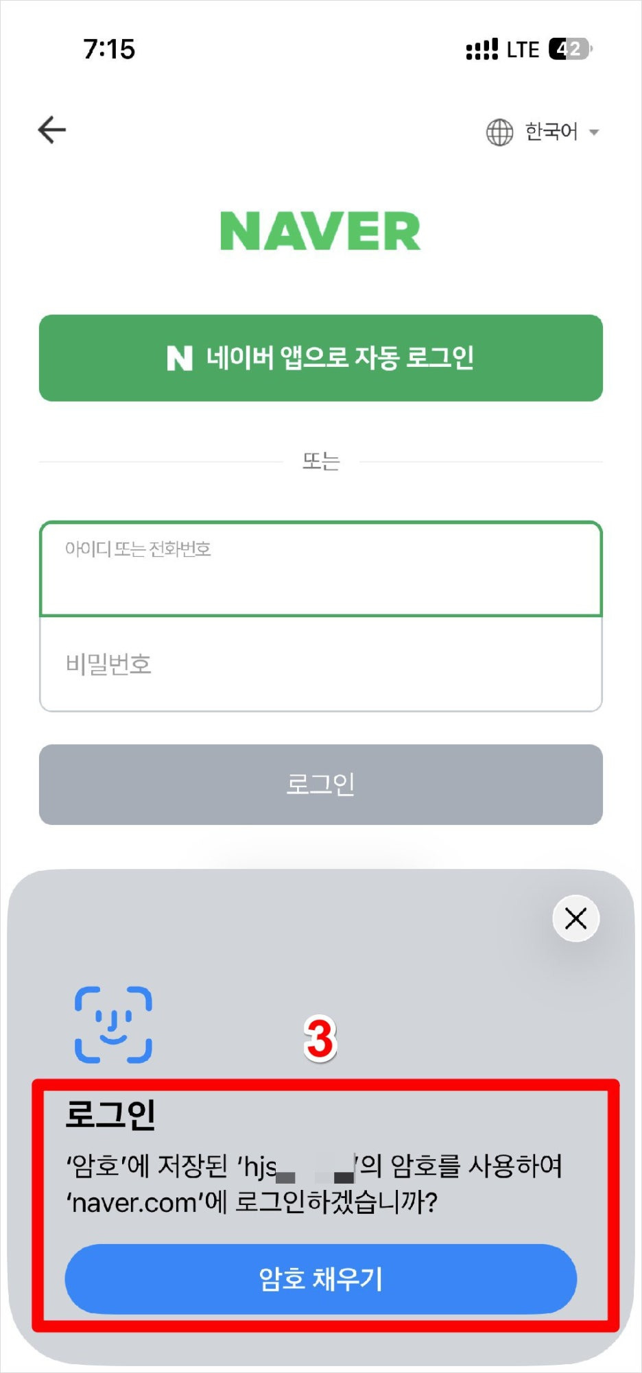그래서 암호 앱을 켜고 네이버 암호를 찾아서 복사해서 로그인을 해야 하는데...