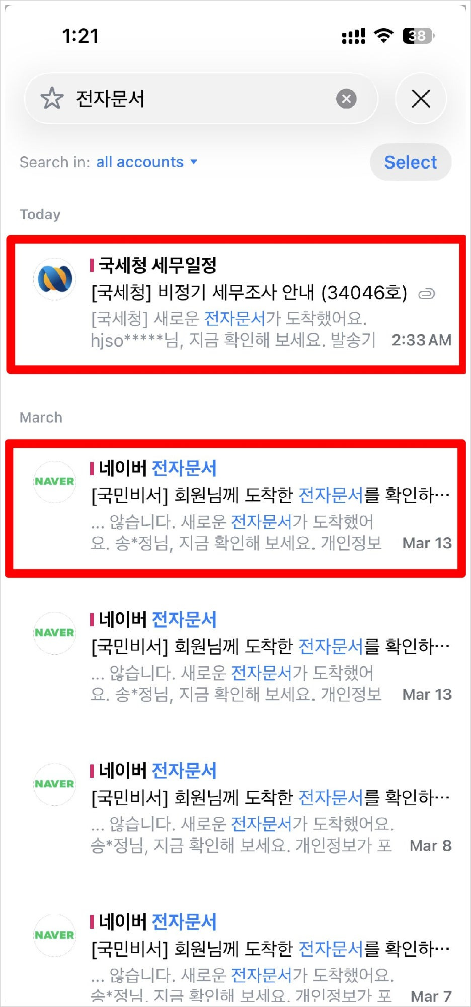 그런데 이상하게도 방금 메일로 받은 [국세청] 전자문서가 없는것 입니다.