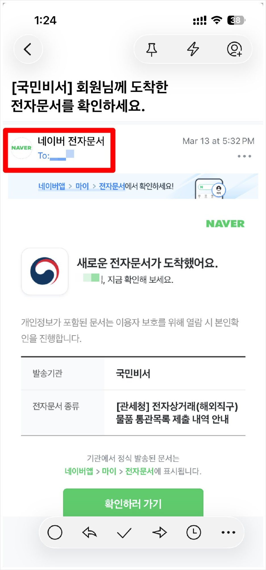 정상적인 전자문서 메일은 아이콘이 "네이버 로고" 인데,