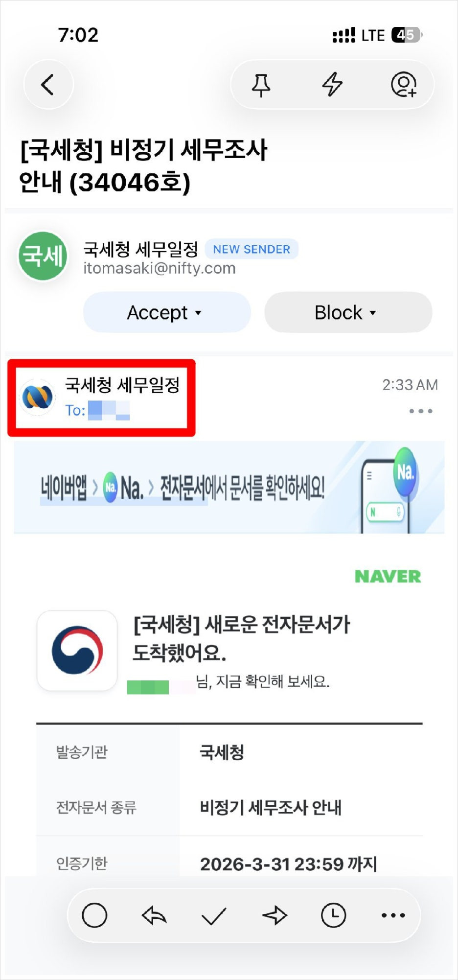 국세청은 절대 이메일로 세무조사를 통보하지 않습니다.