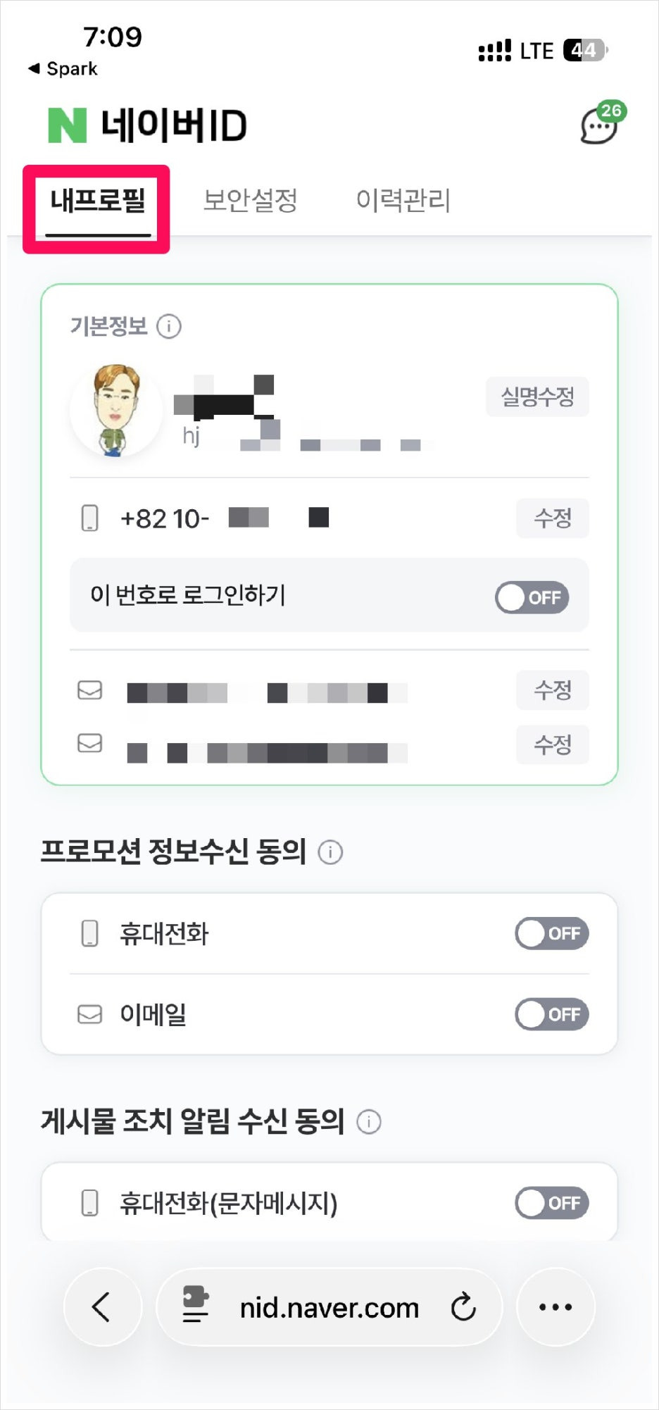 아까 들어간 로그인 페이지에서 [내프로필], [보안설정], [이력관리] 들을 차례로 눌러보았습니다.