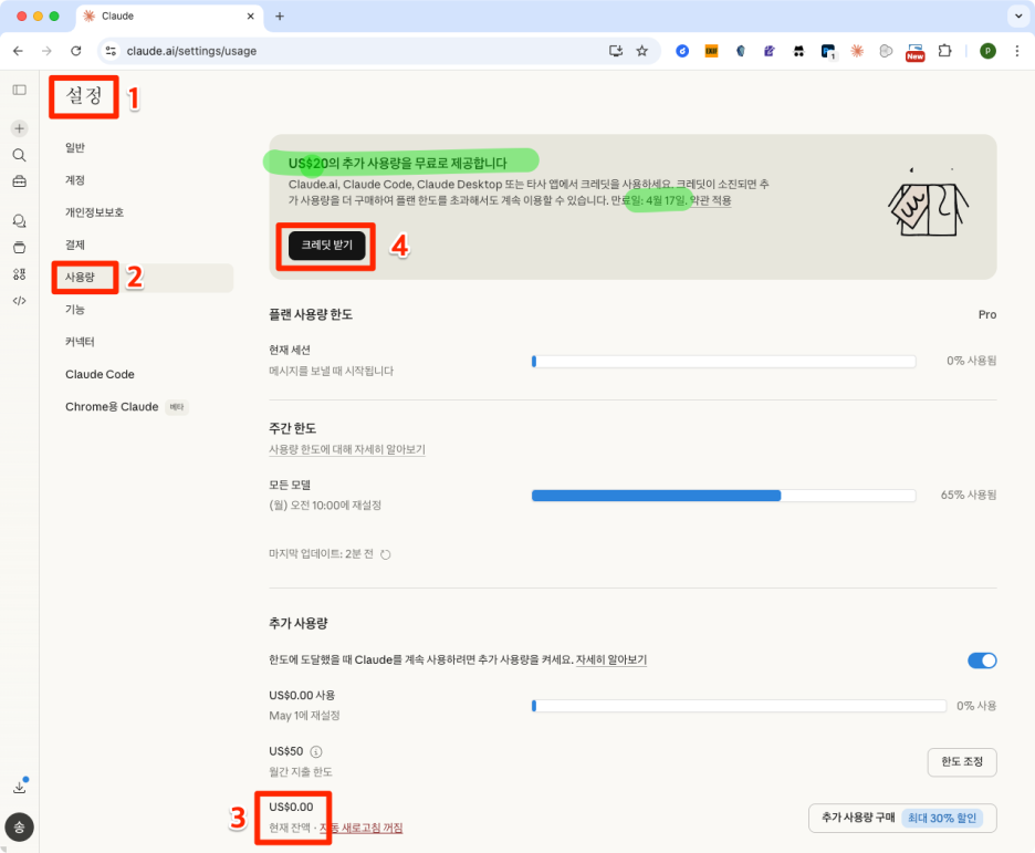 이번에 무료로 받는 $20 크레딧이 바로 이 "추가 사용량"에 충전되는 거예요.