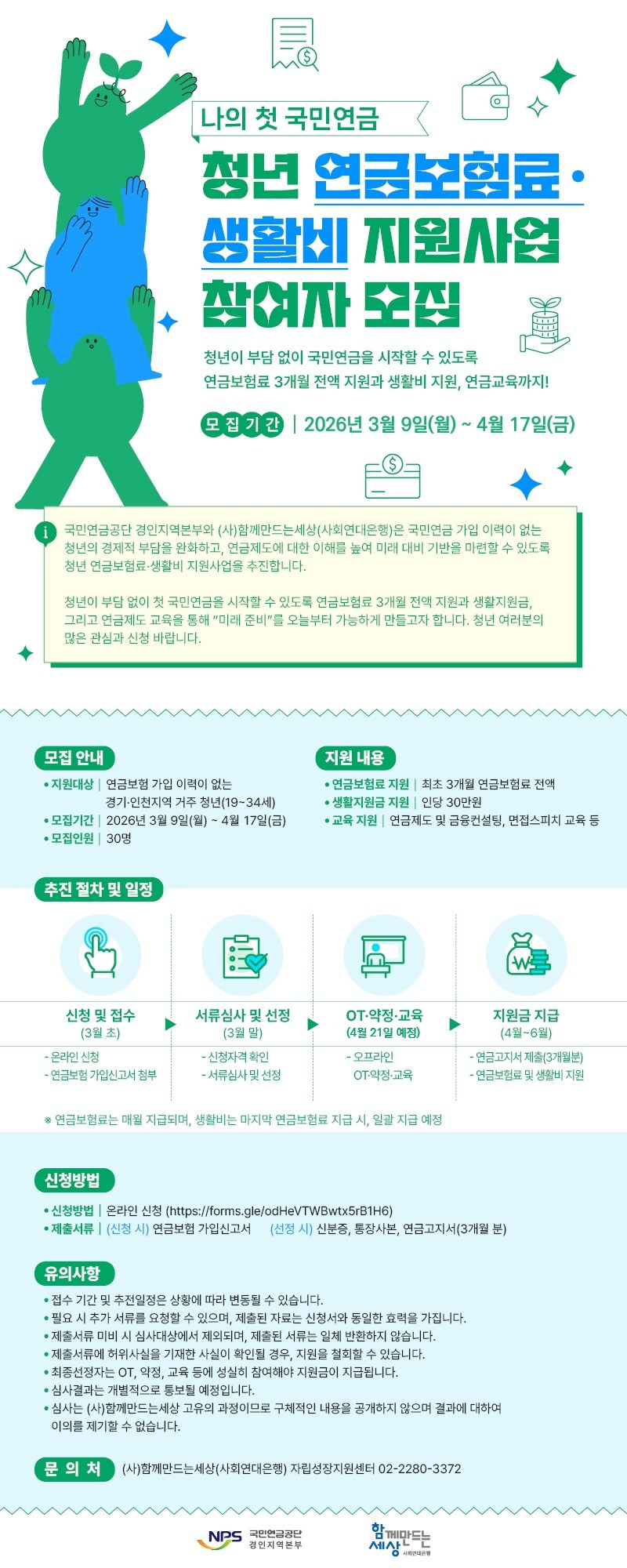 #나의첫국민연금 #국민연금청년지원 #사회연대은행 #함께만드는세상 #청년지원사업 #국민연금공단 #연금보험료지원 #청년혜택 #경기도청년 #인천청년 #생활지원금 #노후준비 #청년정책2026