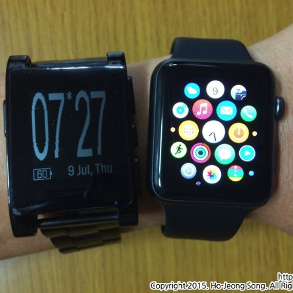 나의 페블 vs 지인의 애플워치... 지인이 구매한 애플와치 잠깐 빌려 차봤습니다. 페블과 비교하니... 애플워치가 이쁘긴 하네요.. 이렇게 빌려서 차봐야 하는 현실이 슬픕니다... 별차이 없어... 그쵸... 휴~ ㅠㅠ